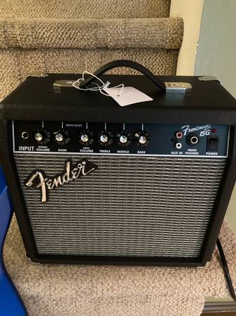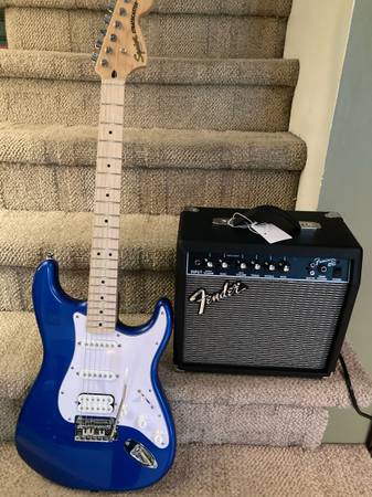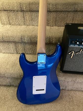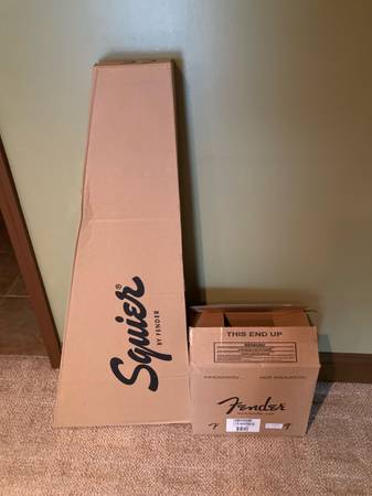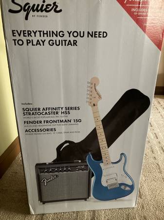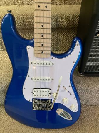 Everything in picture one. Took out of box dressed frets set intonation and tremolo . Great for young players . Everything perfect won’t hurt your fingers on frets. I saved boxes so you could wrap them as birthday or x-mas gifts . Can meet to show almost anywhere SOLD!