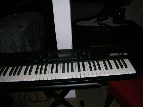 This is an E-MU Proteus MPS Keyboard Synthesizer with 61 synth keys, MIDI input/output ports, digital technology, pitch and modulation wheels, display screen, and transport controls. It also has two pedal inputs and is made in the United States. The synthesizer measures 39 inches in length, 13 inches in width, and 4 inches in height, weighing 25 pounds. It comes with a power supply and has been fully tested.