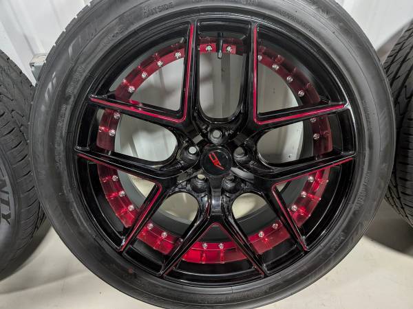 Four 245 50 20 Lexani tires with 80% tread. ORIGINAL COST WAS OVER $2000. These were on a 2021 Ford Edge ST. Fits many other 5 lug 4 1/2 diameter hubs.