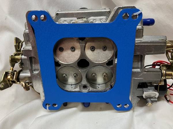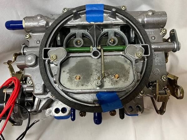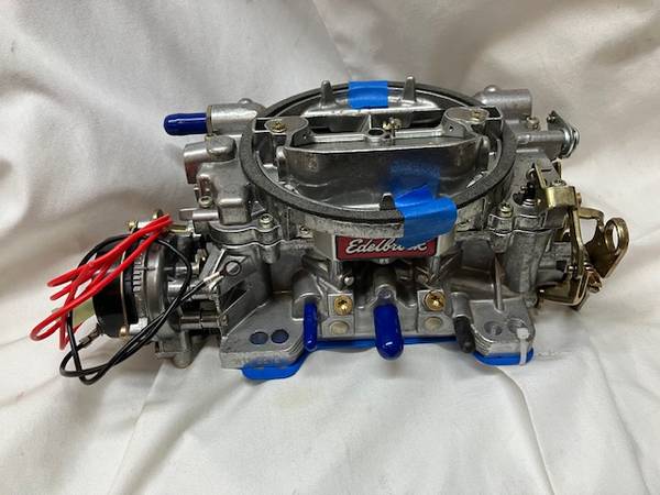 Edelbrock Performer 750 cfm carb cleaned and rebuilt. This carb is mechanically like new and has had very little service. It comes with the blue non-stick intake to carb gasket, gray carb-to-air filter gasket and gray top air horn gasket. It has a new accelerator pump spring and blue ethanol resistant accelerator pump cup seal. All the internal gaskets have been replaced and the floats checked and set. It is completely stock with 0.110 primary jets, orange step up springs and 75 x 47 metering rods. It also has the stock 0.107 secondary jets. All settings made per the kit requirements. It has the two choke wire wires attached to the electric choke spring unit of the carb, as shown. CASH $200-Jim