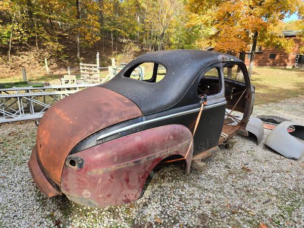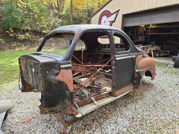 1942-48 Ford business coupe body. It has some rust in the floors and rockers, and a decent dent in the roof. Comes with some other various patch panels.