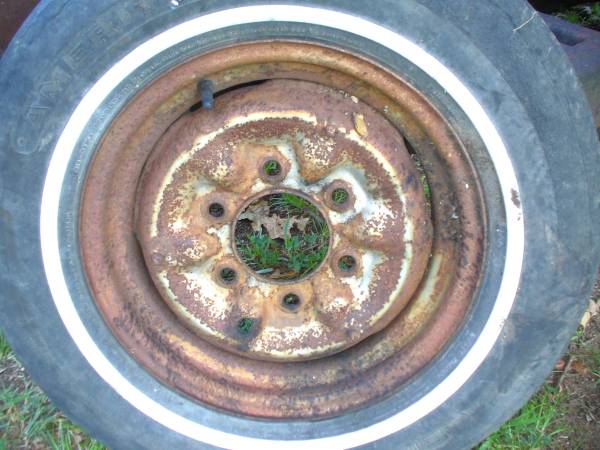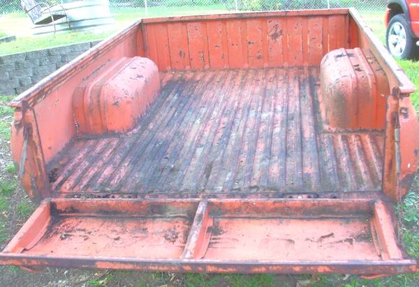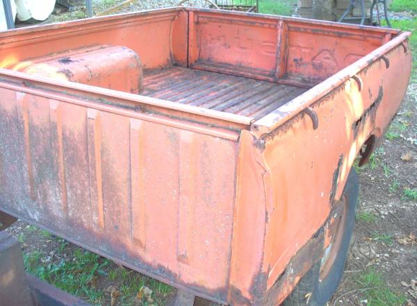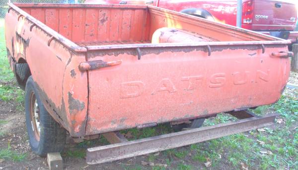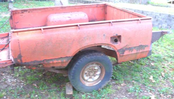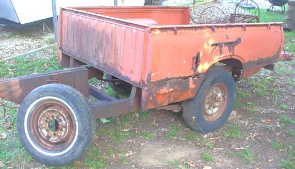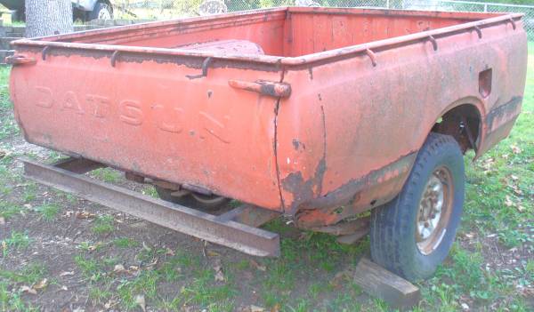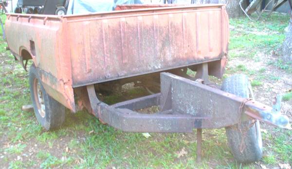 1976 Datsun 620? pickup bed trailer, untitled homemade farm trailer selling as is with rusty 6' x 5' bed, tailgate, rearend, springs, 3 wheels. 2 inch ball hitch. Frame is very rusted, tires hold air but are dry rotted. $350.