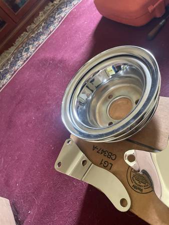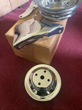 Big box Chevy chrome accessories, alternator, bracket water pump, pulley, and harmonic balancer pulley all brand new never installed. The alternator bracket has a very tiny scratch in the chrome....