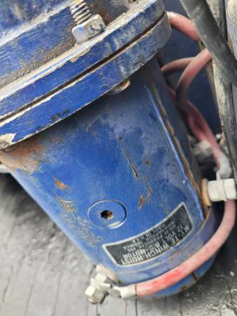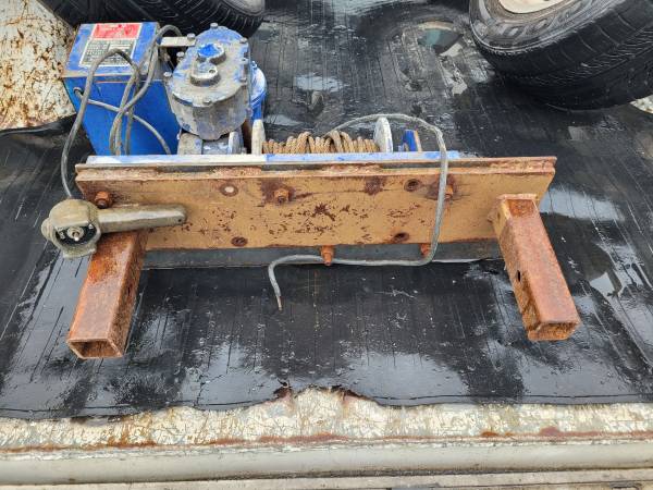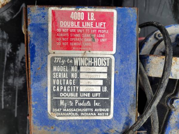 My-te WINCH-HOIST, model number 10-12, with a double line lift capacity of 4,000 lbs. It is a portable electric winch hoist designed to operate on a 12V DC power source, such as a truck battery. MY-TE 10-12 DOUBLE LINE PORTABLE TRAILER CAR TRUCK LIFT 4000 lb Winch Hoist