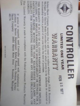Be patient on a response back through email only. Cash only. Automatic electric brake controller made by Kelsey Hayes. Says it's from 1977. Other ones for sale have some blue wire with it. I didn't see a parts list to know what all came in the kit, I thought it was complete. It is unused, nice shape. I usually only check email once a day but not on weekends.