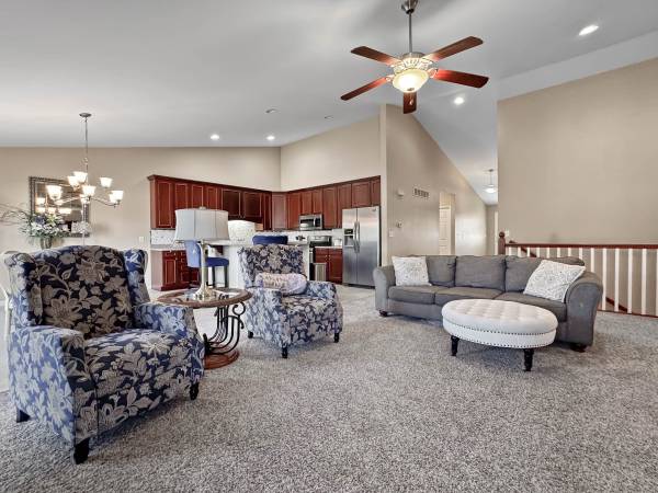 Why pay more for a brand new condo when this beautifully maintained 3-bed, 2-bath gem offers nearly 2,000 sq ft of finished space and maintenance-free living in Freeburg? Say goodbye to lawn care and hello to comfort and convenience. The open-concept layout features LVP flooring, cozy Frieze carpet, and a gas fireplace that makes the living space feel like home. Soaring vaulted ceilings enhance the spacious feel, while the kitchen shines with 42" cabinets, a bat-wing island, stainless appliances, and neutral countertops. Step out from the dining area onto a composite deck—perfect for grilling or relaxing evenings. The primary suite boasts LVP flooring, a garden tub, separate shower, and a massive walk-in closet. A second main-level bedroom also includes a walk-in. Downstairs, enjoy a third non-conforming bedroom with full windows, a walk-out patio, and a finished flex space ideal for an office, gym, or guest room. Bonus: rough-in for a future bath. Located in a quiet, friendly neighborhood just minutes from shopping, dining, and top-rated schools, this condo offers the perfect blend of privacy and convenience. With a spacious 2-car garage, dedicated laundry room, and thoughtful layout, it’s ready for you to move in and make it your own. Whether you're downsizing, upgrading, or investing, this home delivers unbeatable value. Condo fee of $240 per month takes care of most exterior maintenance including roof, landscaping, lawn, snow removal and more.