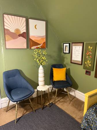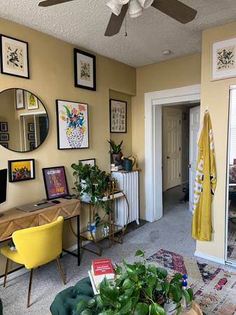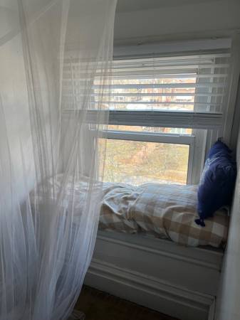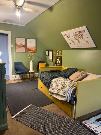 Beautifully maintained 160 year old home with original hardwood floors, big windows and tall ceilings, working brick fireplace, chef's kitchen, spacious backyard with 2 decks and edible garden, and plenty of cozy spaces to curl up with a book. This is a 5 bedroom house with 3 bathrooms. Rooms come furnished with bed, bedding, and storage. Garden features 11 fruit trees (peaches, nectarines, cherry, pawpaws, fig, persimmon, elderberry), 2 blueberry bushes, 1 blackberry bush and an over 5 strawberry plants. Garden is open to residents that live in the building. Herbs, greens, and produce as well! Additional storage is available in the basement. 2 rooms are currently available--1 on the third floor (faces north)/shared bathroom with one other person. Trundle bed offers two places to sleep with a toddler bed available upon request. The third floor room is open for anyone but is suitable for a parent and child. The second bedroom is on the second floor (faces north)/shared bathroom with one other person. Has shelving, closet, desk, and pull out bed. There are currently 3 housemates, all women.
