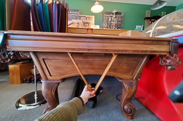 For sale the RackR8ck a convenient way to hang the billiard rack on your pool table. No more walking back and forth to the wall rack. The RackR8ck replaces the cheaper brass hooks.