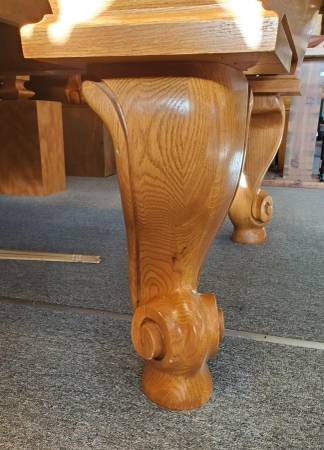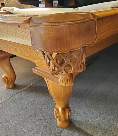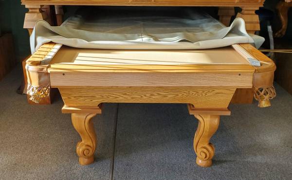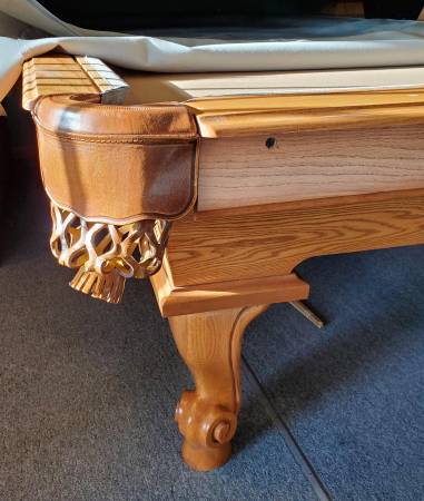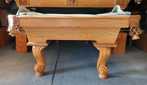 For sale USED 8' "The Solid Oak" pool table. Made in the US circa 1991. There is no no name plate on the table. The rails, cabinet, and legs are made of solid Oak wood. The cabinet is 1 3/4" thick. New cushions, leather pockets, and Championship billiard cloth. 1" 3- piece Italian slate. This table has been refurbished to be like a "new" table, but for the price of a used table. The table is currently on display at our store.
