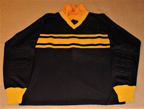 Here for sale is a Soccer Keeper/Goalie Jersey with padded elbows Black/(Gold or Yellow) Soccer Goal Jersey with padded elbows. This was made by Action Sports, the tag states - Large (I believe this is a Youth Large). It is in very good condition (high quality item). Item has been well cared for and comes from a smoke and pet free home. Please see pictures to judge the condition for yourself.
