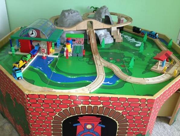 Wood train set with table and storage.