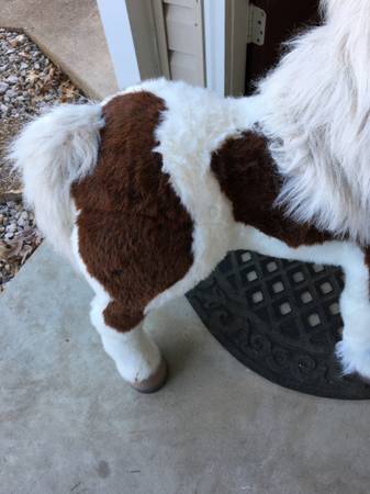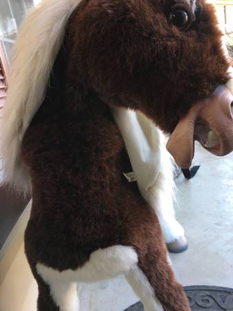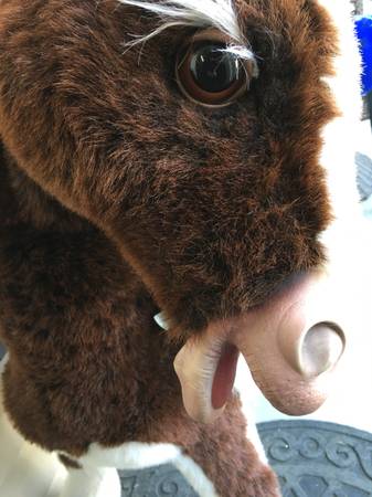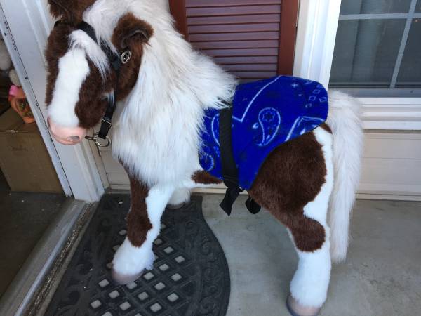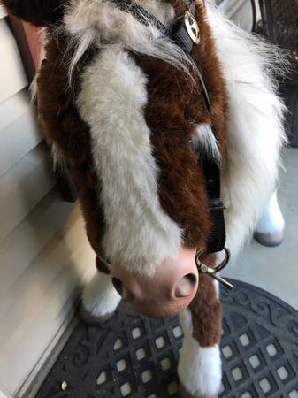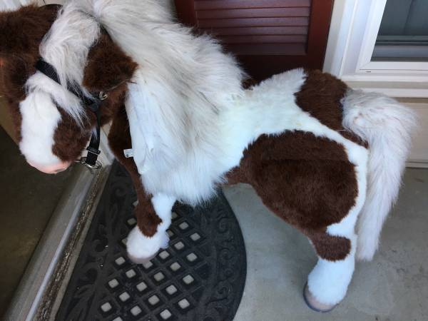 Super cute Smores Pony Vintage Interactive Toy for someone who's always wanted a pony but didn't have a place to keep one! Stored since purchased. Works and is in good condition. Can support a child on its back up to 80 lbs, doesn't walk. Can pretend feed it and it makes a munching sound and swishes it's tail and head around, also twitches it's ears. You can call its name and it moves head/ neck in your direction. If the room is dark, it will go to sleep and awaken when lights come on. Soft saddle and bridle included.