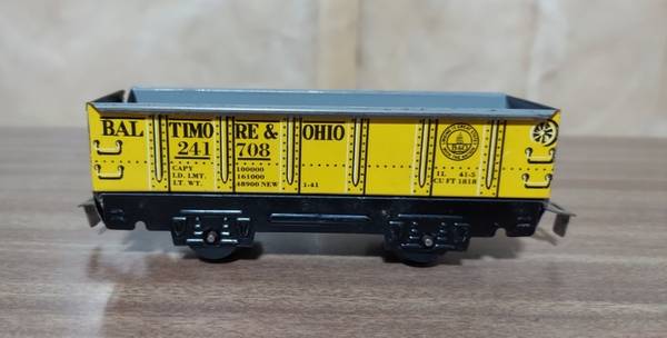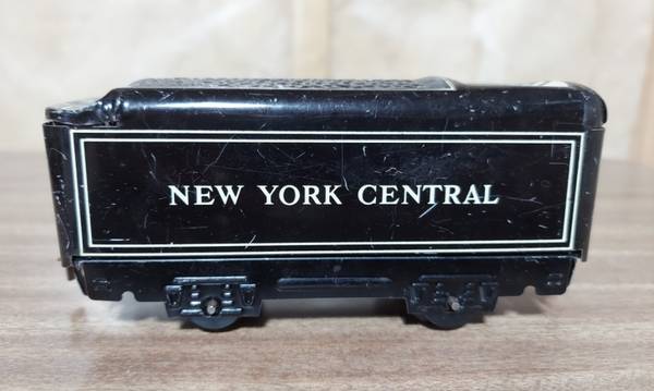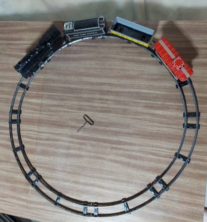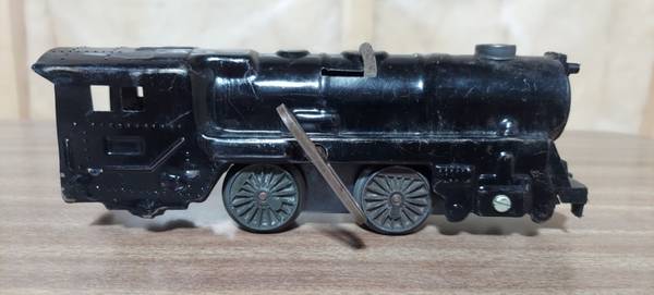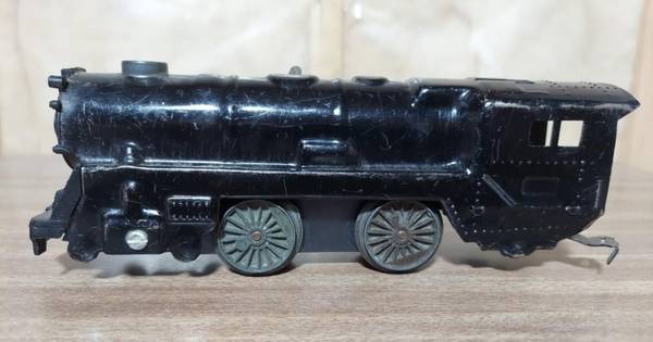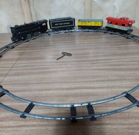 I believe this train set would be from the 1940s and was manufactured by Marx. There are 8 track pieces each about 10” long, the total track circle is 27” diameter. The engine is a wind up engine; key included, is 10” long and still runs. Each car is 6” long. Used by a couple of generations.