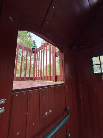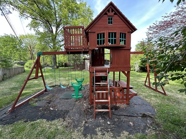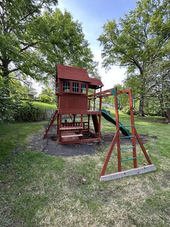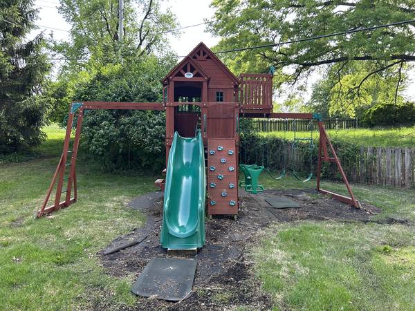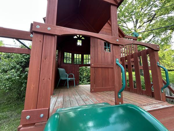 This Backyard Discovery Skyfort II Cedar Swing Set / Play Set is used but in great shape. We stained all the pieces with (2) coats of stain prior to construction so it will last a very long time. Some surfaces do show some wear but can easily be touched up. A partial can of stain is included so that you can match the existing finish.