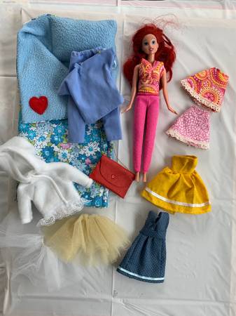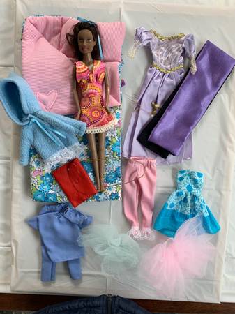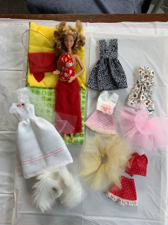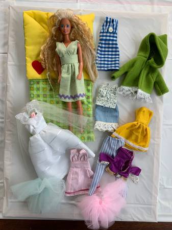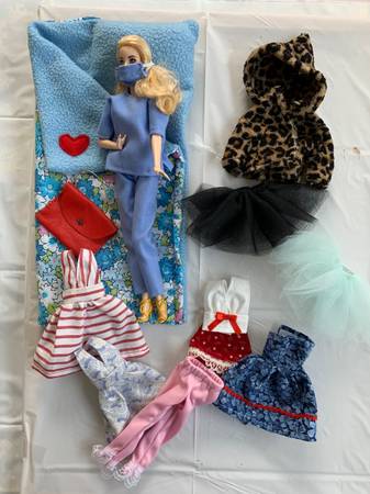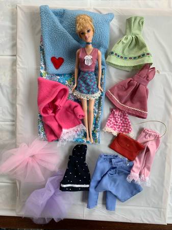 Includes a Barbie doll plus a wardrobe of handmade outfits, a couple of tutus and a sleeping bag. Each set is $5.