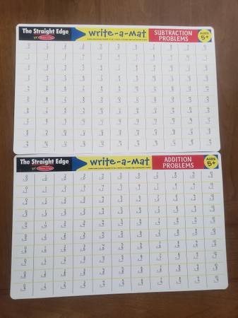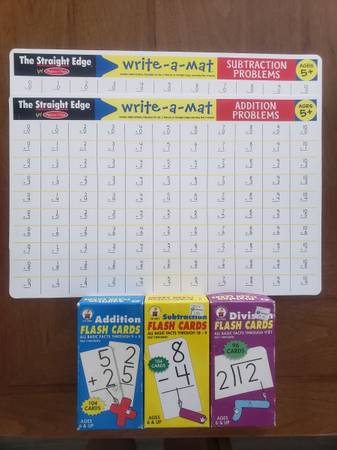 2 Like New Melissa & Doug The Straight Edge Write-A-Mat Double Sided Addition and Subtraction Problems Age 5+. Also Addition, Subtraction, and Division Flash Cards for Age 6+. All sets are complete.