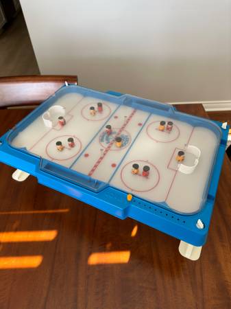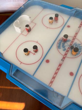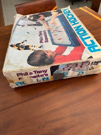 I am selling a vintage (circa 1970-ish) Phil & Tony Esposito’s Action Hockey Game by Parker Brothers. This is a table-top game that is in good used condition. Players move the teams around the rink via magnetic pieces above and below the board. Team players and puck are self-contained under a clear plastic rink cover. Top cover is clear with few scratches. Game is complete and includes original box and instructions…although the box is rough.