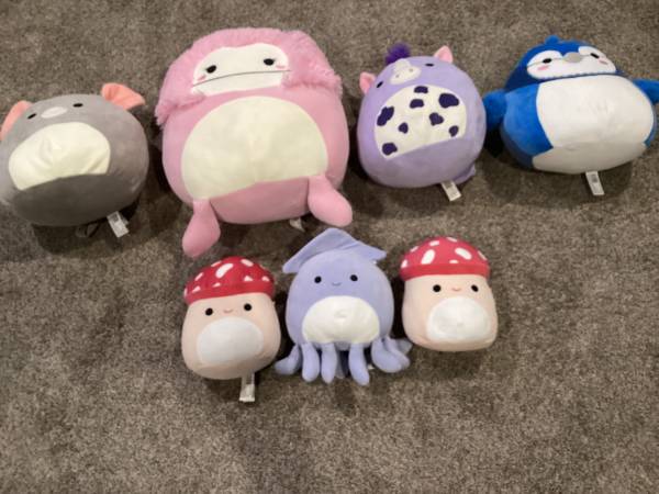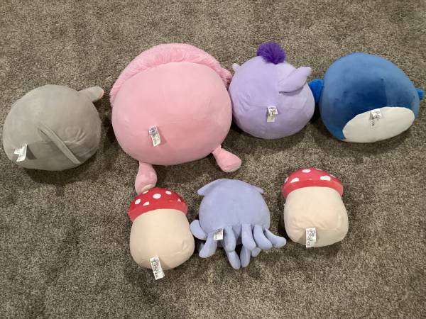 I am selling 7 original Squishmallows. Benny the monster 16 inch, Misty the mouse, Meadow the Horse and Babs the Blue Jay, 12 -14 inch, Stacy the Squid, 8 inches and two Malcolm the mushroom 8 inch. All are like new, with tags, and have only been on display. These are from a pet and smoke free home.They’re in like new condition.
