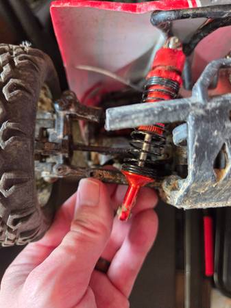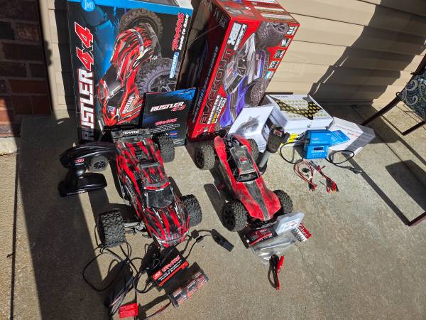 Traxxas Rustler 4x4 and RedCat XBE buggy with boxes, manuals and batteries. Each car has a 2nd battery included. Additional items are a charger and safe charging box with some spare parts. The Traxxas with 1 battery sells new for $430 by itself. Both cars run great. The RedCat has a broken front suspension piece that needs to be fixed, shown in the 2nd and 3rd pictures. It drives, but the unattached strut affects offroading. Had it temporarily fixed with a metal zip tie that worked very well. Step son lost interest in the cars before I ordered replacement parts.