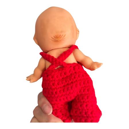 Adorable mid-century Kewpie doll made in Japan, measuring approximately 8 inches tall. Crafted from soft vinyl rubber, this vintage treasure features classic blue eyes, molded hair, and a sweet smile. The doll wears a handmade red crocheted overall outfit with buttoned straps, adding a charming touch of nostalgia and craftsmanship.