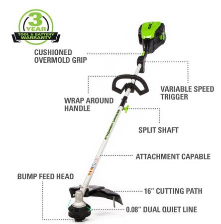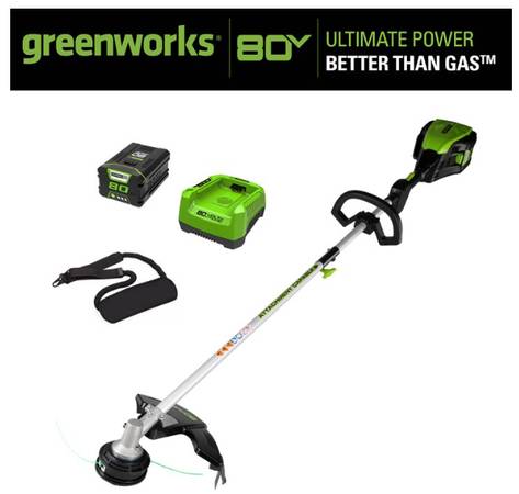 I’m selling a brand new Greenworks 80 Volt (80V electric) 16 inch Brushless Attachment Capable String Trimmer with 2.0 Ah Battery and Charger, 2101102. Comparable to Craftsman, Kobalt Lowe's or Menard's Masterforce 80V trimmers.