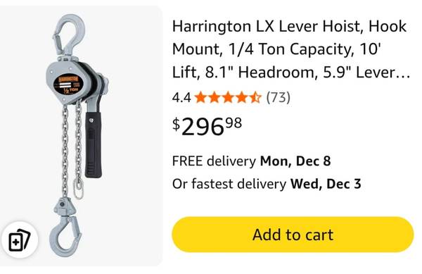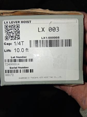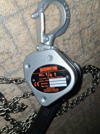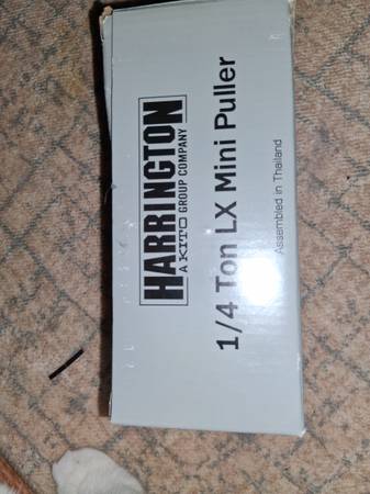 Harrington Model LX003 1/4 ton lever hoist. New in box, won as a safety award. Same item is $296 on Amazon.