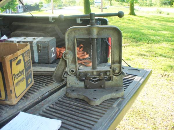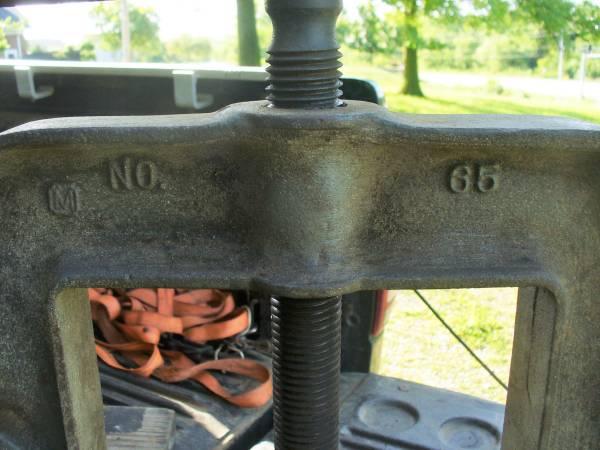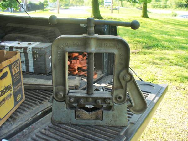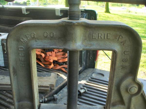REED MODEL 65 pipe vise, jaws handle 1 inch to 8 inch pipe, 21 1/2 inches tall, 21 1/2 inches wide. Model No. 65, Made by Reed MFG. Co. Erie PA. U.S.A. Used, in very good condition. This is like new, was hardly used as it came out of a auto repair shop. $500.