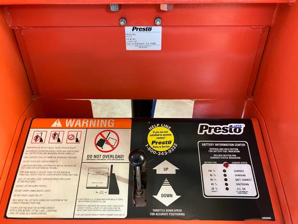 Have a real nice Presto with hardly any use. See all pictures. Has a built-in charger that plugs into a 120-volt outlet. There is a parking brake to keep it from rolling. Has a brand-new Duracell battery. I do have the cover to it, was taken off for pictures only. Everything works as it should. Has always been maintained and kept inside since new. These sell for over 8 grand new. Take $2,500 cash in person. No holds, shipping. Don't waste my time with low ball offers.