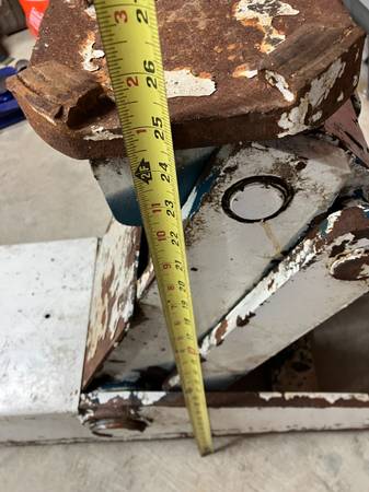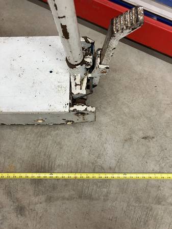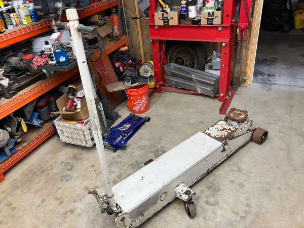 When I had bought it, I was told that this jack was made by Bend Pak. This jack is about 68 inches long and goes up 25 inches. The pad does rotate. Was painted the original blue and then painted white at some point. See last picture of the cylinder size. Take $600.00 cash. These jacks sell for over $3,000 new. Must pick up in person. No shipping or trades. I do have a skid loader here with forks to load.