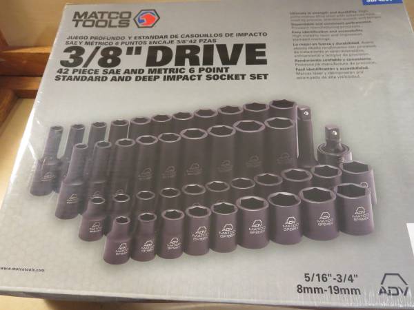 Matco Tools ADV SAE and Metric General Service Impact Set Model No. SBP426V 42pc. set 3/8" Drive sockets ... 195.00 . new , with Carry case See pictures . local pick-up" ..... phone ( no text ) show contact info