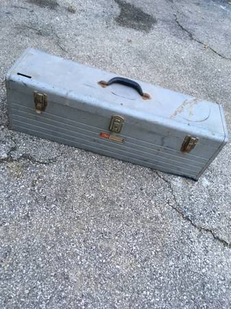 This Craftsmen toolbox made by Sears is in very good condition. It has a vintage look/feel if you like that, but is definitely able to handle, protect, and haul around your tools. Removeable tray inside and working snap closures.