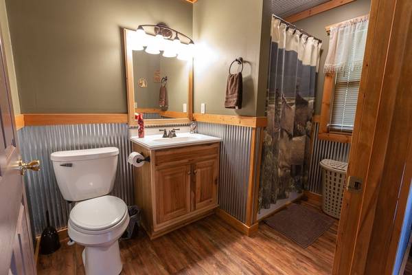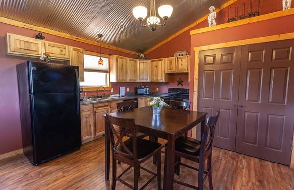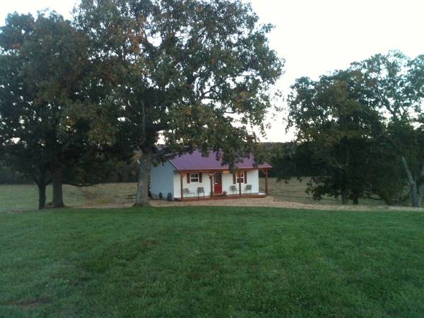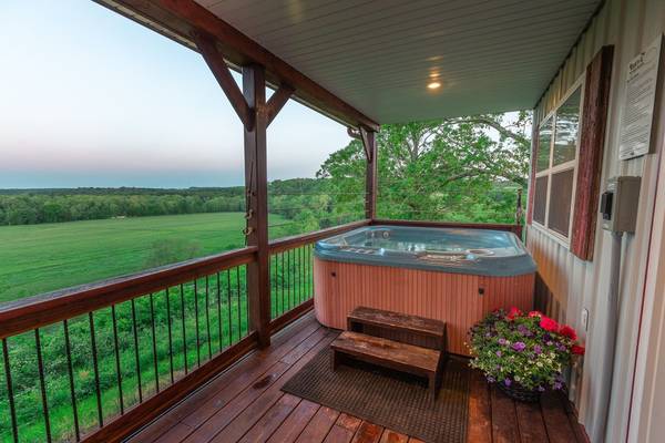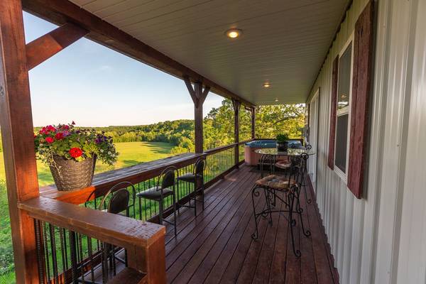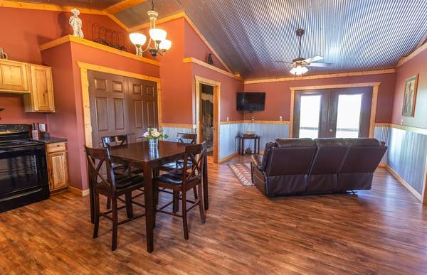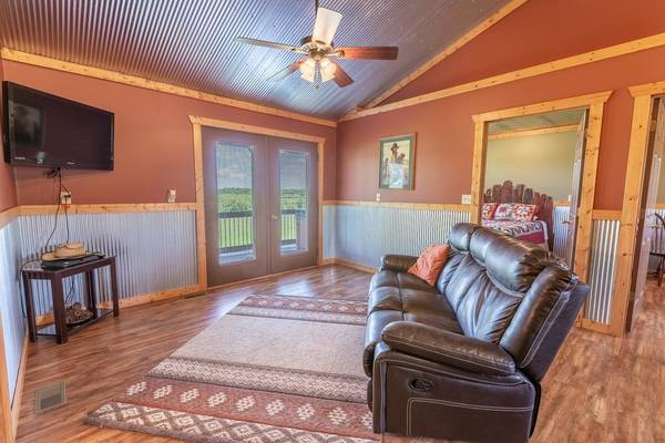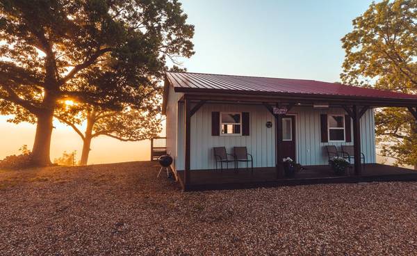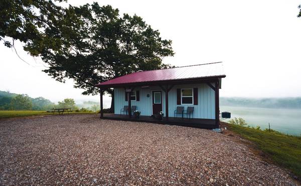 The Sunrise Cabin is fully furnished with 2 queen beds, all kitchen utensils, appliances, and linens. A full-sized washer and dryer and a dishwasher provide guests with all the comforts of home. All you need to bring are groceries, and if you would like to use the BBQ grill, charcoal and lighter fluid. The interior of the cabin is designed to make guests feel relaxed and comfortable. From the back deck, you can enjoy the astonishing views of the rolling hills, river, and fields below. The nearby pond holds some of the largest bullfrogs you will ever see and plenty of fish for you to catch. A picnic table, fire ring, and horseshoe pits are in the shade next to the cabin for guests to enjoy with family and friends.