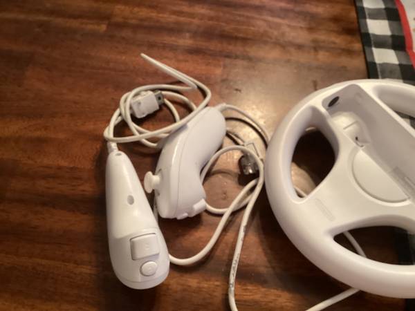 Wii game system with controllers, cords, and an assortment of games. In good condition