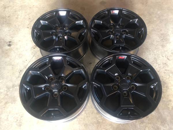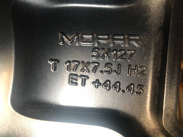 Set of 4, 2023 Jeep Gladiator or Wrangler 17" wheels for sale. Wheels are 17" x 7.5" with an offset of 44.45, a part number of 6KC88TRMAA, and a bolt pattern of 5 x 127 mm or 5 x 5". Wheels are in great condition overall, but some imperfections as shown. These will fit Wrangler's and Gladiators from 2007 and newer. Asking $400 for the set of 4. Thank you 314-FiveEightThree-9945