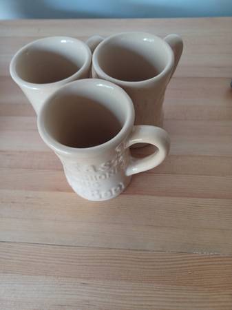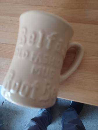 Heavy ceramic. Reads "Belfast Root Beer". Appear to be about 8oz capacity.