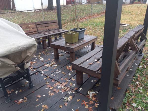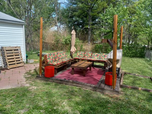Hand made,outdoor seating set and table made from used pallets and repurposed lumber. I made this set in the spring of 2023 or 2024 for my lil hang spot. But next year I'm doing something more conventional. So this set is up for grabs. Nice and sturdy. I'm 6',265lbs and they hold me just fine. Solid and strongly built. Had 16 cushions to go with but my dog decided to taste test 6 of them. 10 cushions left...I think. All free,you haul. Or I may be able to haul for you(within 20 miles...$25 to cover my fuel). Only the 4 seats,table and remaining cushions are being offered.