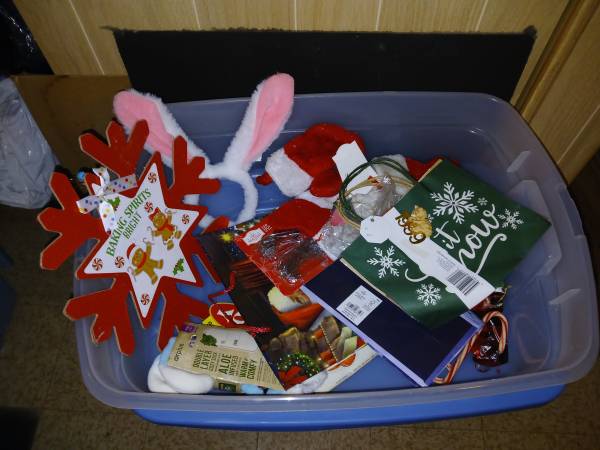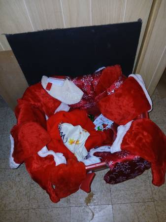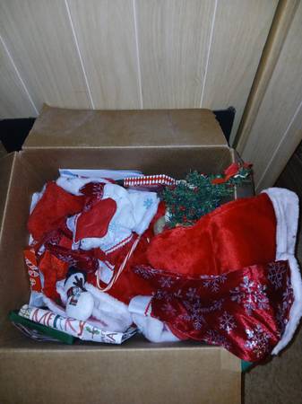 About 16 Xmas stockings, some names written on them, can be painted over or covered by clever crafter. Plus misc small decorations, lil tree, gift bags, tags, wall hanging, etc.