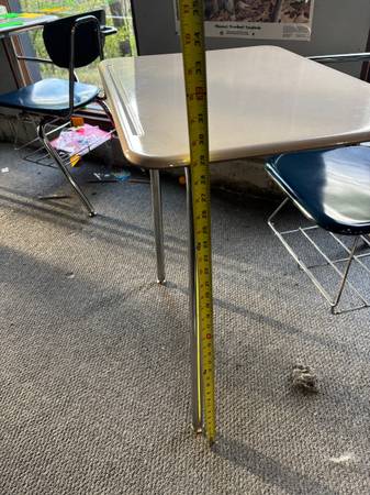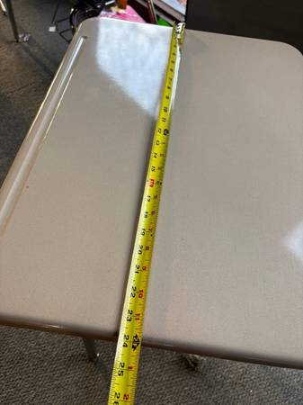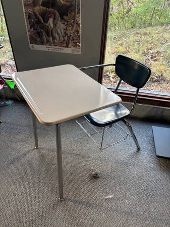 We have ten school desks available to whomever can come get them. Any and all are available. See pictures for measurements. All are the same color.